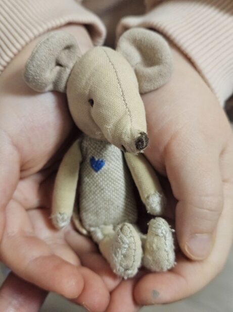 Keď sa na myške začal jemne ukazovať čas, začala som ju opravovať. Postupne dostala nové telo, nový chvostík. A teraz, keď ju drží pokope už len pár nitiek, vnímame jej hodnotu prítomnosti ešte hlbšie.